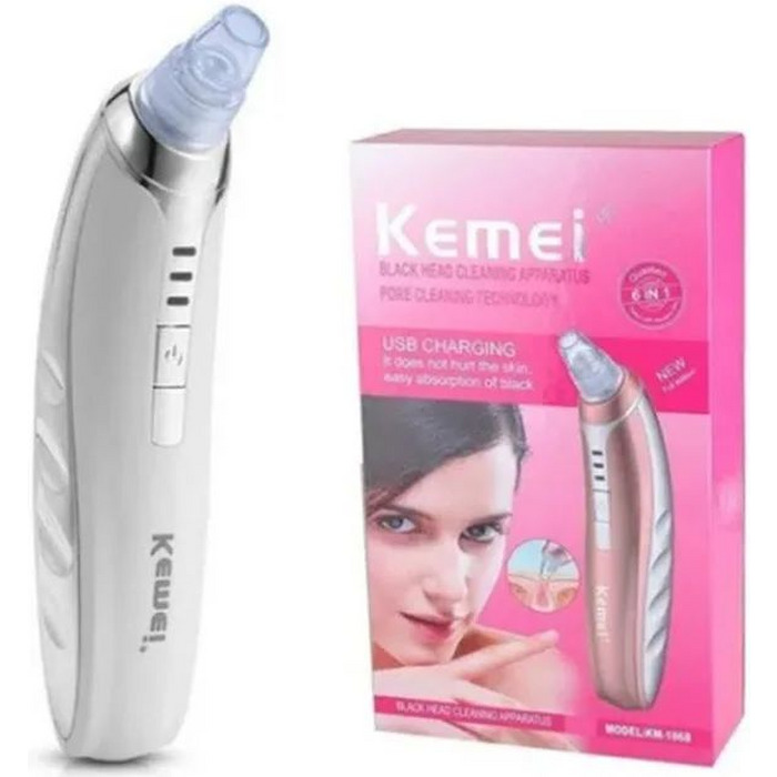 Removedor de cravos e espinhas elétrico usb com led Removedor de cravos kemei km-1868 Equipado com 6 peças diferentes e substituíveis com tamanhos do furo e da formas de cabeça de sucção diferentes, trendo diferentes forças e efeitos durante o uso. Os acessórios são removíveis, de fácil limpeza. Bateria recarregável embutida de 600 mah, de carregamento usb, podendo ser carregado através do computador, tomada de conector de celular e quaisquer outros dispositivos de interface usb.